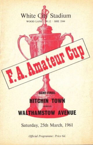 The north Herts club was resurrected almost 100 years ago after the earlier Hitchin FC folded. We met them in their first season playing in the Spartan League but they didn’t stay long, gaining promotion in their first season. In the years since then they have plied their trade one or more steps above us in the amateur and non-league game until relegation last season brought them within our orbit again. Beyond league football Hitchin Town have made numerous apperances in the competition proper of the FA Cup and reached the semi-final of the FA Amateur Cup in 1961 (see the image above) and 1963. They’ve also won the Herts Senior Cup on 14 occasions.
